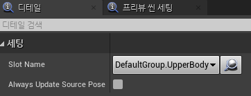 애니메이션 블루프린트로 돌아와서 원하는 DefaultSlot 선택 후, Slot Name을 아까 추가한 슬롯을 선택해주면 된다.
