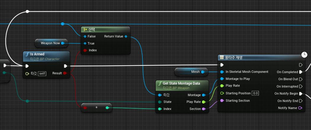 이를 해결하기 위해서 Set WeaponNow에서 Is Armed함수로 실행핀을 옮김으로써 현재 무기를 해제 후, 교체할 무기의 애니메이션이 자연스럽게 나오도록 수정해주었다.