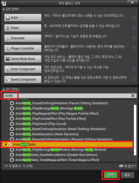 모든 클래스 선택에서 AnimNotifyState를 선택하여 추가한다.(ANS_AttackEnabled)