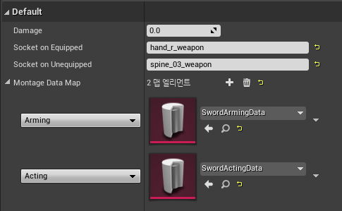 이어서 만들어준 SwordActingData를 사용하기 위해 BP_Sword의 Montage Data map에 새로 추가해준다.