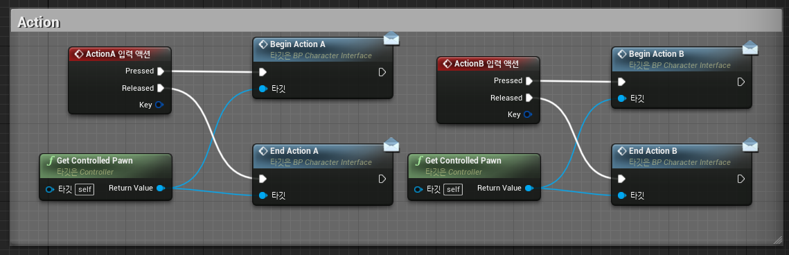 캐릭터의 입력을 담당하는 BP_PlayerController에 가서 ActionA, ActionB 추가하여 메시지 발생시키기.