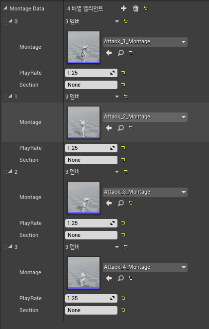 (Attack_1 ~ 4까지 애니메이션의 몽타주를 생성해주고 SwordActingData에 넣었다. 몽타주의 슬롯도 FullBody로 변경)