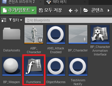 따라서 해당 함수를 전역으로 사용할 필요가 있기 때문에, 블루프린트 함수 라이브러리를 추가해준다.(Functions)