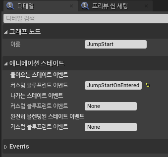 여기서 추가해준 스테이트는 애니메이션 블루프린트 이벤트그래프에서 해당하는 노드를 따로 추가해줄 수 있다.