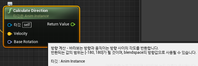 보다시피 Calculate Direction은 두 백터(바라보는 방향 / 움직이는 방향)를 이용해서 각도를 구하는 함수라고 할 수 있다.