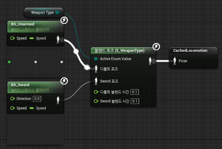 ABP_Character(애니메이션 블루프린트)의 AnimGraph에서 Locomotion과 CachedLocomotion의 연결을 끊어주고E_WeaponType 블렌드 포즈를 추가해준다.