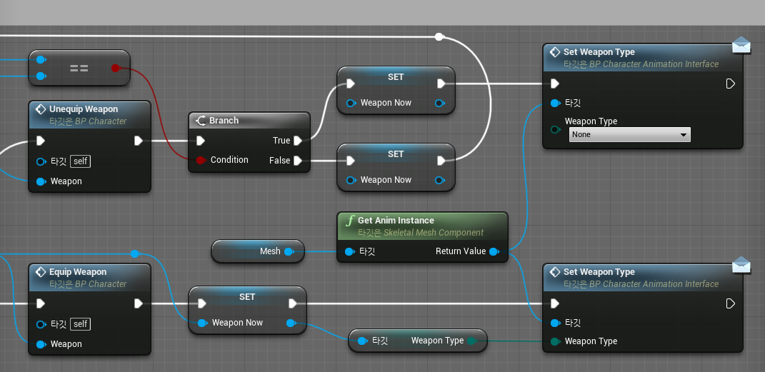 BP_Character에서 무기 장착 이벤트를 구현한 로직 마지막에 장착과 해제 시 각각 WeaponType을 입력해준다.