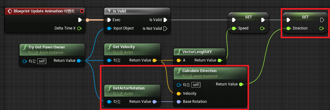 여기서 Direction을 구하기 위해 Calculate Direction 함수를 사용하게 된다. 이미 언리얼에서 해당 기능을 구현해놨다.