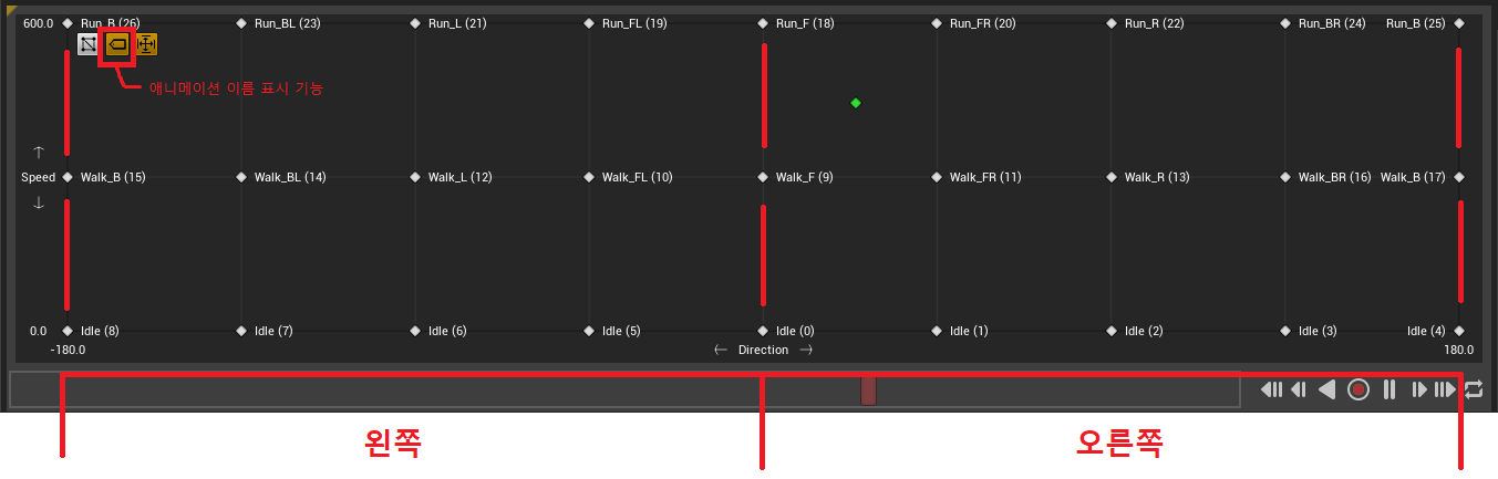 축 세팅을 완료하고 이제 애니메이션 트랙에 각각 방향과 속도에 맞는 위치에 애니메이션들을 배치해준다.