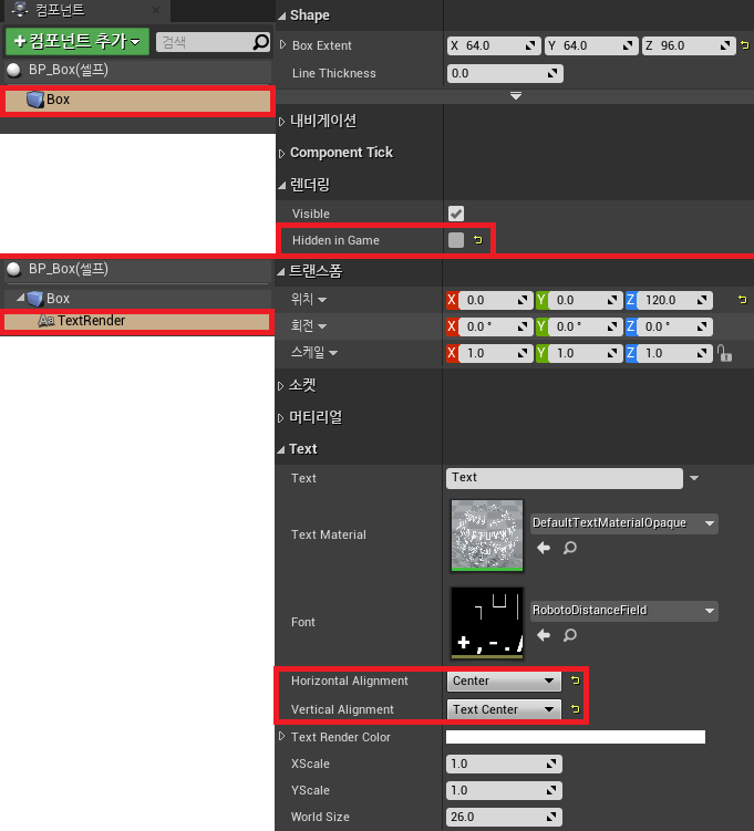 새로 만든 BP_Box에 Box Collision과 TextRender를 통해 충돌 검사를 할 것이다.