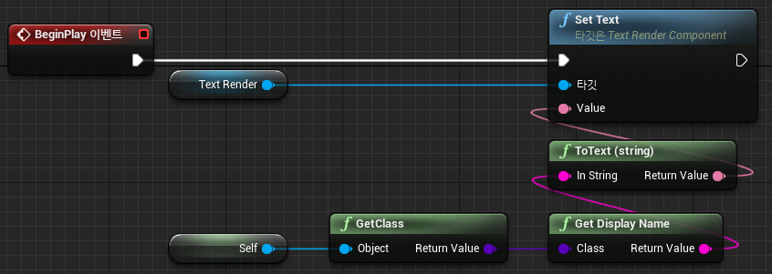 BP_Box의 이벤트그래프에서 실행과 동시에 클래스의 이름을 가져와 Text에 설정하여 화면에 나오는 것을 볼 수 있다.