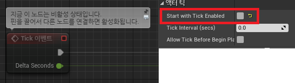 ※ 만약 Tick 이벤트를 사용하지 않는다면, 클래스 디폴트의 Start with Tick Enabled를 꺼주는 것이 좋다.