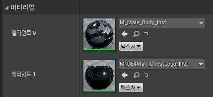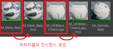 콘텐츠/Meshes/Mannequin/Character/Materials 폴더 안의 Body, ChestLogo 머티리얼의 인스턴스를 생성해줬다.