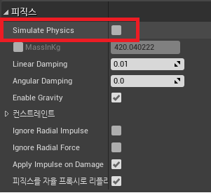 Collision 컴포넌트에 보면 피직스에 Simulate Physics가 있다. 이 기능을 사용하게 되면 대상이 중력을 비롯한 물리 법칙의 영향을 받게 된다.