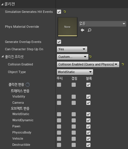 - Collision Enabled : 활성화된 콜리전의 유형