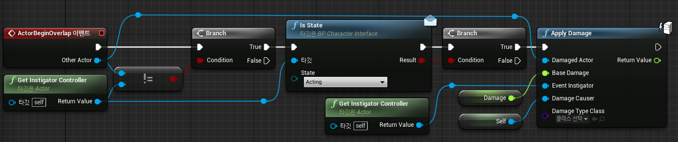 먼저 Controll 대상의 현재 상태가 Acting인지 확인을 위해 Is State를 추가하여 공격 중이 아닐 때에는 대미지가 발생하지 않는다.