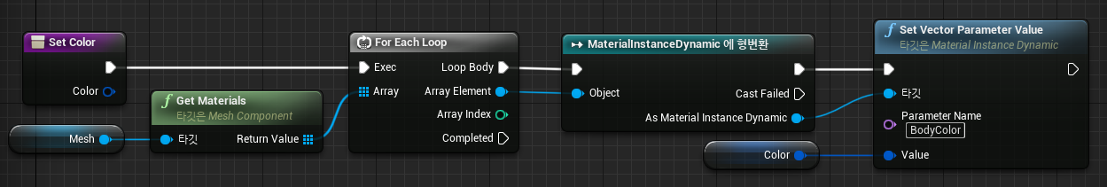 따라서 MaterialInstanceDynamic으로 형변환 시켜주고, Set Vector Parameter Value를 통해 BodyColor의 값을 바꿔준다.