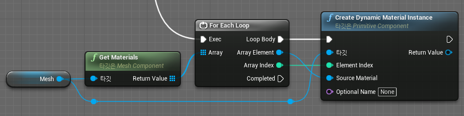 - CreateDynamicMaterialInstance (Mesh에서 뽑음) : 인스턴스를 만들고 그 자리를 대체해준다.