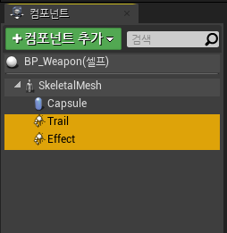 무기 공격 시 효과를 주기 위해 BP_Weapon에서 ParticleSystem 컴포넌트를 추가해서 Trail / Effect 두 개를 만들었다.