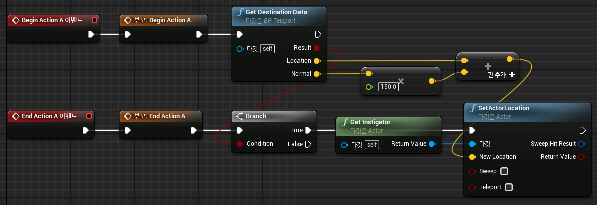 그리고 해당 Result의 값으로 EndActionA에서 True일때만 SetActorLocation을 통해 이동시키게 된다.