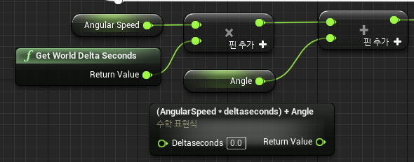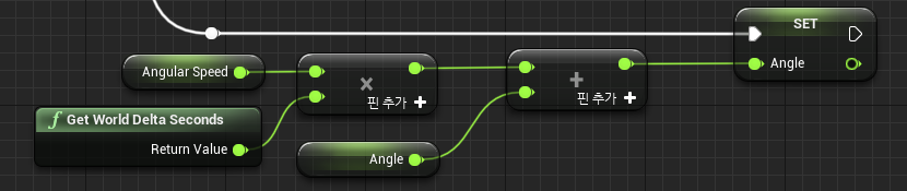 Get World Delta Seconds(Tick 이벤트의 DeltaSeconds와 같음) * AngularSpeed를 곱한 값에 Angle를 더하여 저장해준다.