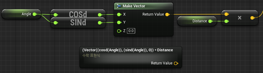 다음으로 먼저 Vector를 만들어주었다. Make Vector를 추가하여 x, y에 각각 COSd(코사인), SINd(사인)를 연결해주었다.