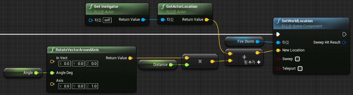 그리고 FireStorm에서 SetWorldLocation을 꺼내 위에서 계산한 Location을 넣어주면 된다.