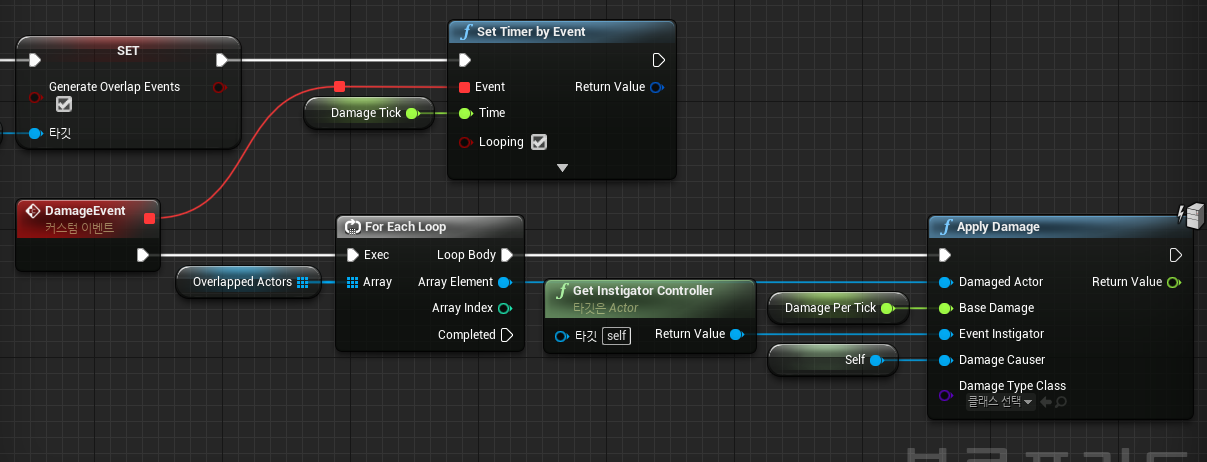 데미지를 주기 위해서 ActorBeginOverlap / ActorEndOverlap에서는 Overlap 충돌로 받아온 Other Actor들을 OverlappedActors에 ADD / REMOVE 해준다.