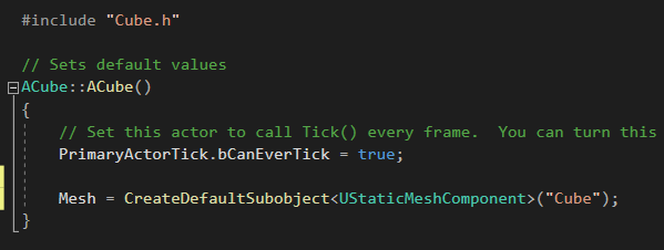 따라서 ACube() 생성자에서 Mesh에 UStaticMeshComponent를 넣어준다. 이어서 빌드를 해주면 된다.
