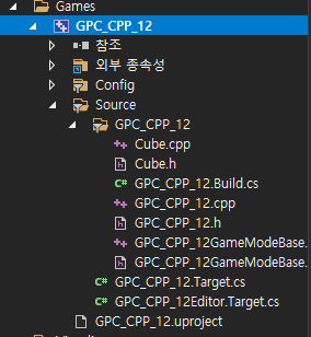 그리고 솔루션 탐색기에서 GPC_CPP_12GameModeBase 헤더와 CPP 파일의 이름도 GPCGameModeBase으로 바꿨다.