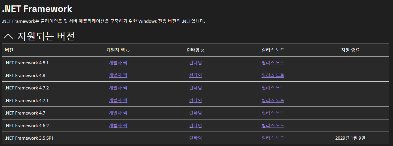 dotnet.microsoft 페이지로 가서 .Net Framework에서 4.6.0 이상의 버전 아무거나 설치해주면 된다.