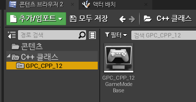 언리얼 에디터에서 필터를 보면 C++ 클래스 폴더 안에 GPC_CPP_12 클래스가 생성되어 있는 것을 볼 수 있다.