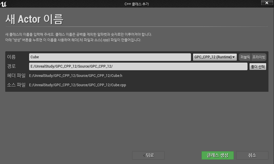 우클릭 - 새 C++ 클래스를 선택하면 부모 클래스 선택 화면이 뜬다.