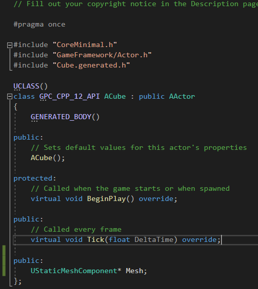 - Cube.generated.h : 언리얼에서 자동으로 완성시켜준 코드