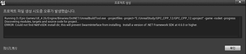 만약 프로젝트 생성 시 아래와 같이 오류 발생 메세지가 뜨면서 .NET Framework SDK 설치를 하라고 한다면