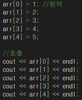 배열의 정의와 호출은 위 사진과 같이 해주면 된다. 하지만 무언가 비효율적인 방식인 것 같지 않은가?