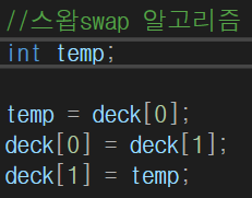 위의 방법처럼 임시 저장할 변수 temp를 선언 후에 deck [0]의 값을 저장해두면 사라지는 값 없이 무사히 스왑이 된다.
