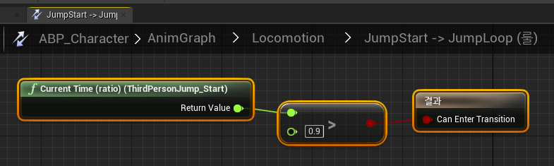 JumpStart 애니메이션이 다 재생되면 바로 JumpLoop로 넘어가는 것이 자연스럽다.