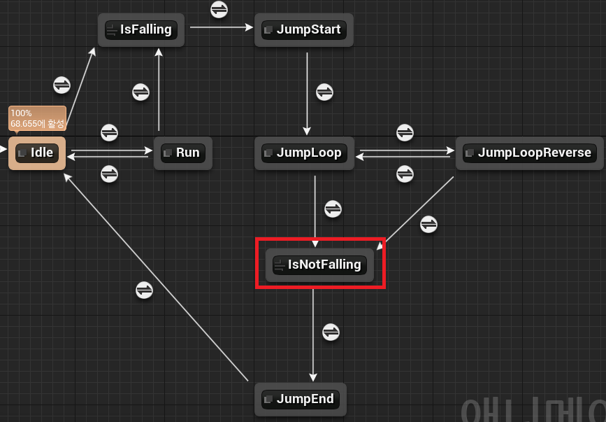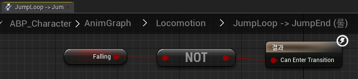 JumpLoop와 JumpEnd를 연결하는 트랜지션 룰은 IsFalling - NOT - 결과의 조건으로 다시 바꿔준다.