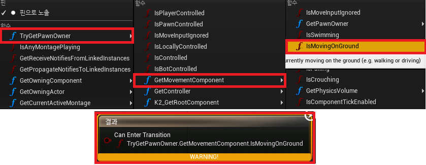 따라서 TryGetPawnOwner - GetMovementComponent - IsMovingOnGround의 조건을 줄 것이다.