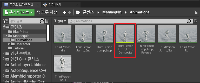 이제 JumpLoop와 JumpLoopReverse 애니메이션 두개를 합쳐주기 위해서 콘텐츠 / Mannequin / Animations 폴더에서