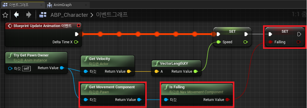 IsFalling(컨듀잇)에서 TryGetPawnOwner - GetMovementComponent - IsFalling을 사용하여 조건을 판별했었는데,